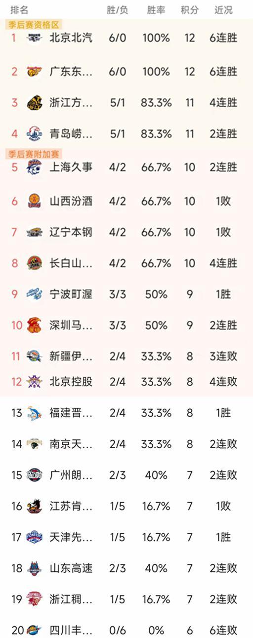 卫冕冠军广厦和青岛的战绩都是5胜1负,广厦近期迎来4连胜,青岛昨晚88-81掀翻了山西,韦瑟斯庞的28分6助攻力压迪亚洛的22分4助攻。上海、山西、辽宁和吉林都是4胜2负暂列第5-第8名。
